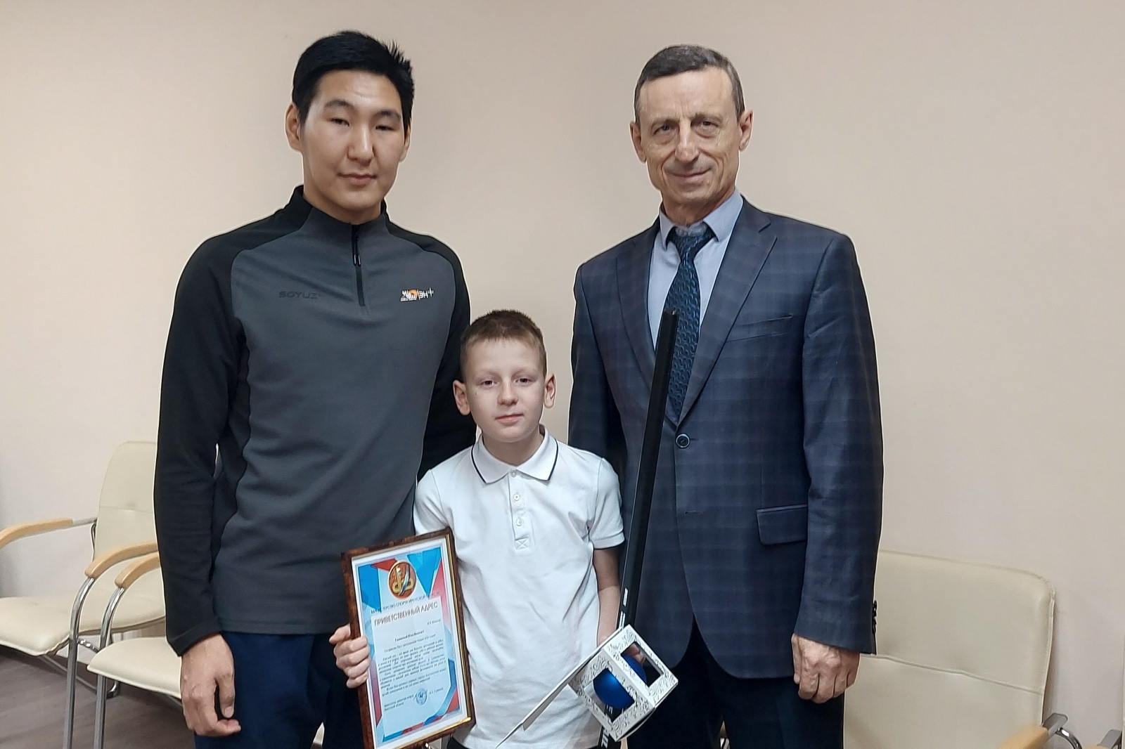 Вместе с поздравлением Илья получил ценные подарки: клюшку с автографами игроков хоккейного клуба «Байкал-Энергия» от вратаря команды Павла Спасова и билеты на матч с «Саяны-2», который состоится 25 декабря в Иркутске. Удовенко и Спасов пожелали Илье успехов в учебе и спорте, а также достижения звания мастера спорта России.