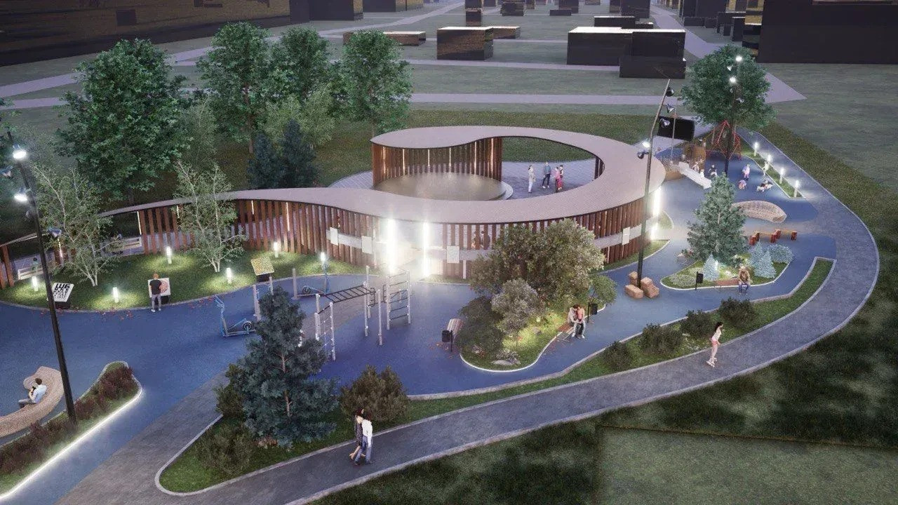 Ключевым архитектурным элементом станет пергола с колоннами и художественной подсветкой. На всей территории запланированы прогулочные дорожки, резиновое покрытие для детских площадок, наружное освещение и масштабное озеленение — высадка клёнов, кустов сирени и посев газонов.