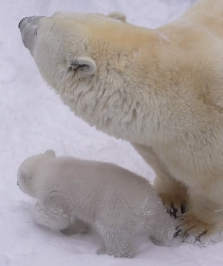 Как рассказывают в зоопарке, детеныши белых медведей появляются на свет незрячими и беспомощными, их вес составляет всего около 600 граммов. В первые месяцы мать не оставляет детеныша ни на секунду.