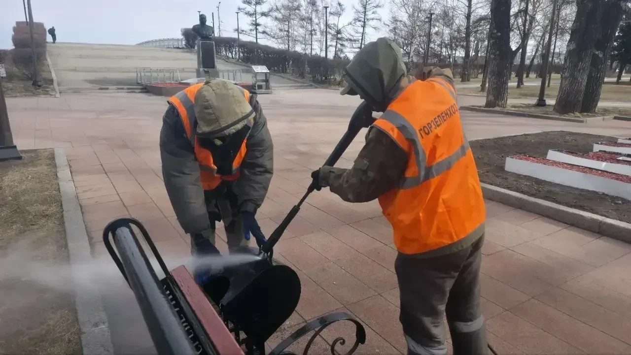 Еще одно направление работы — помывка памятников и арт-объектов. Этим тоже уже занимаются. Подрядчики моют памятники, а также красят скамейки, урны и ограждения. Сегодня такие работы проводят в сквере имени Кирова, историко-мемориальном комплексе «Иерусалимская гора» и на острове Конный.